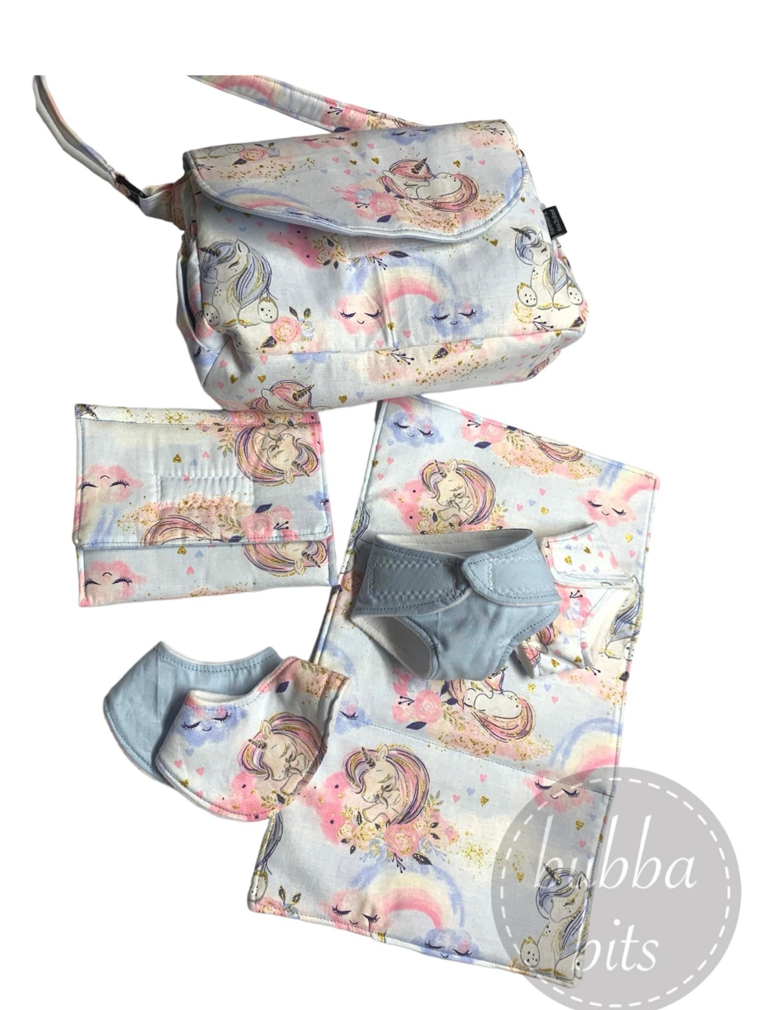 Delight your little one with this charming doll-sized nappy bag set, perfect for imaginative play. This set includes: