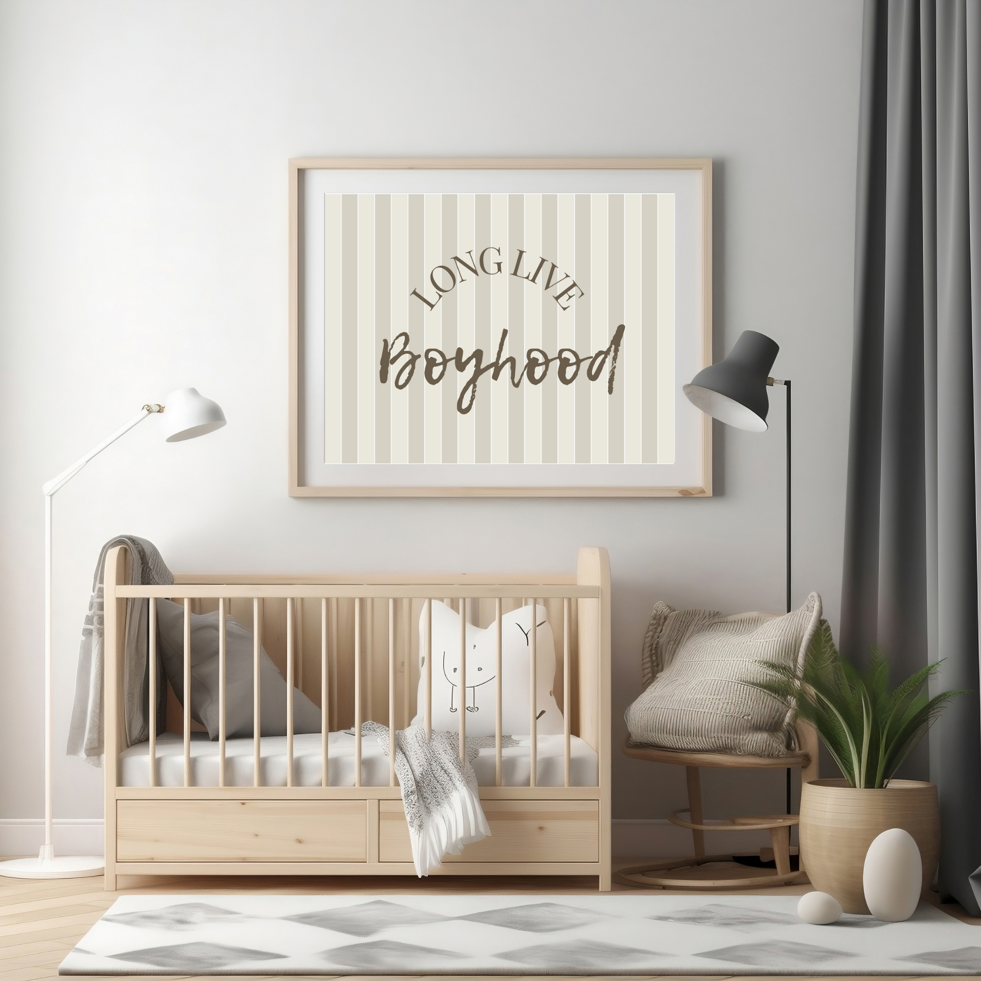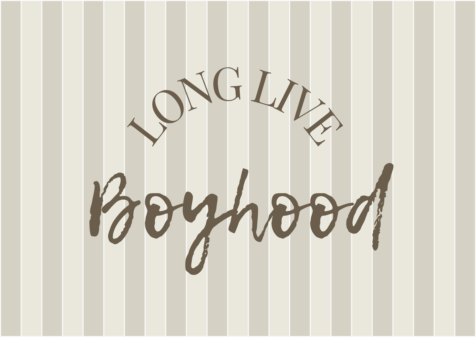 Featuring the inspiring phrase “LONG LIVE BOYHOOD” in a charming cursive font, this artwork is set against a classic striped background of alternating light and dark shades.