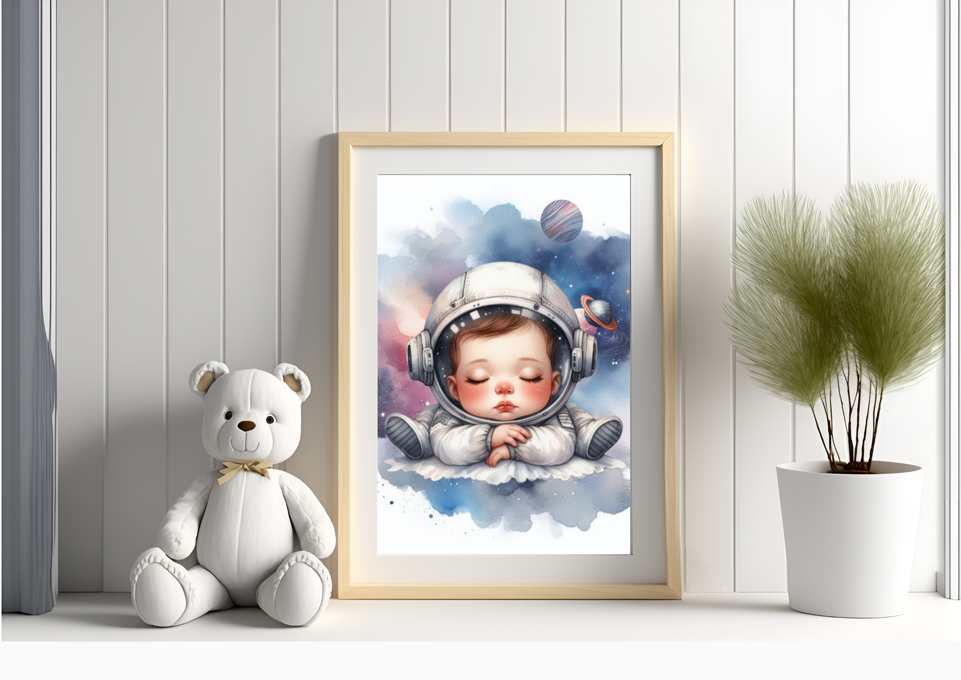 Step into outer space with our charming watercolor art print featuring an adorable sleepy baby astronaut!