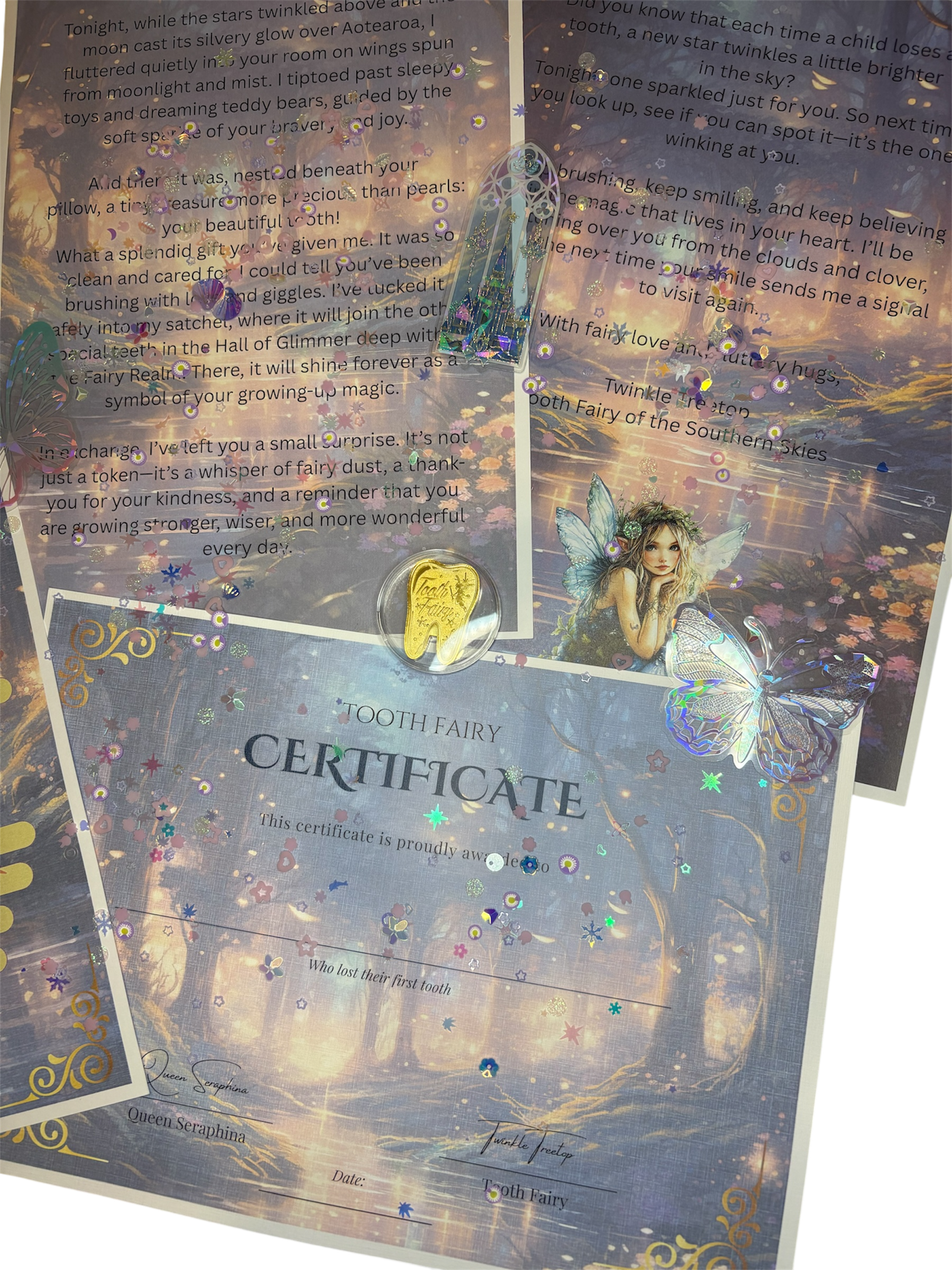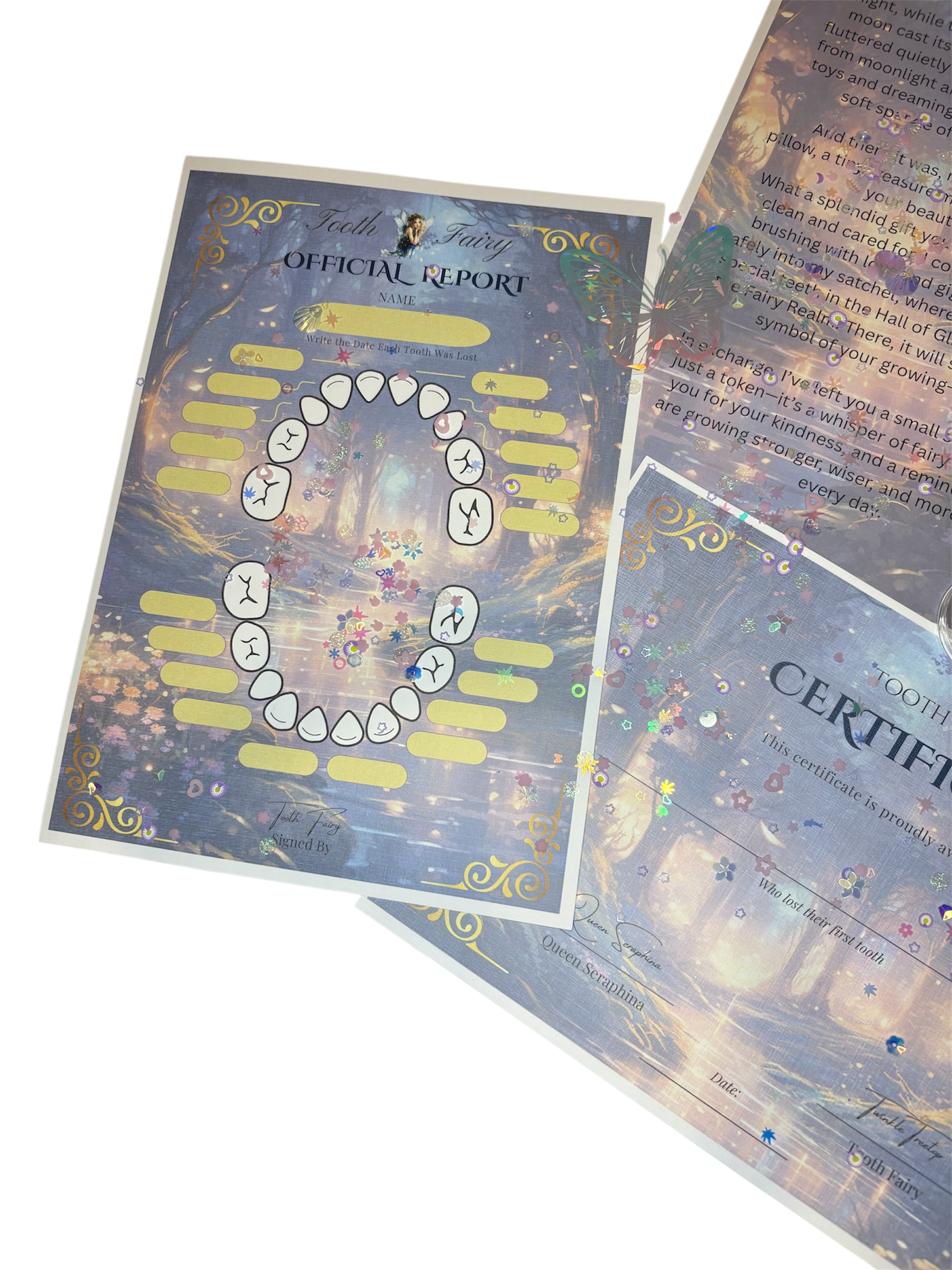 - A personalised letter from the Tooth Fairy, written with warmth and whimsy, congratulating your child on their bravery and welcoming them into the Tooth Fairy Circle